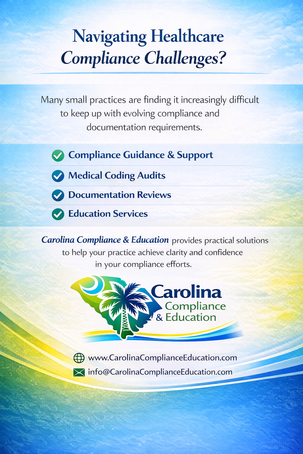 Thank you for your interest in Carolina Compliance & Education. We welcome the opportunity to learn more about your practice or clinic and discuss how our compliance, auditing, and education services may support your organization.